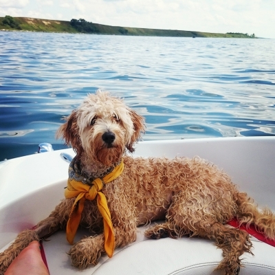 Lua, Ryan's Mini Goldendoodle, enjoys long walks, doing laps around the yard, bugging Cooper, posing for pictures, and invading everyone’s personal space with lots of kisses.